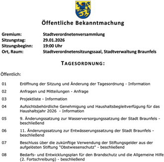 | Ort, Raum: | Stadtverordnetensitzungssaal, Stadtverwaltung Braunfels |