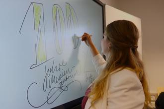 Die Besucherinnen und Besucher konnten bei der Feier die verschiedenen Medien vor Ort testen und dem Medienzentrum Grüße zum 100. Geburtstag hinterlassen. (Foto: Lahn-Dill-Kreis)