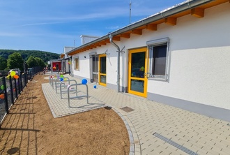 Das freundliche und helle Konzept der Kita setzt sich ebenfalls außen fort.