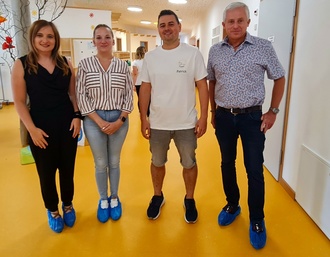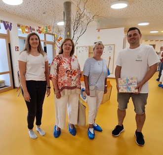 Trafen sich zu einem kleinen Rundgang: Julia Pflaum, Fachdienstleitung Personalservice, Marie Leuninger, Fachbereich Kindertagesbetreuung, Patrick Link, Kitaleitung Kita Sonnenburg sowie Christian Biniarz, 1. Stadtrat Braunfels.