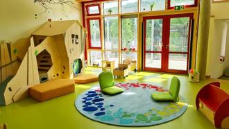 Ein Kitaspielbereich mit Blick auf die Burg in Philippstein.