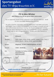 Der TV 1894 Braunfels bietet ab September 2023 in der Turnhalle der Carl-Kellner-Schule Braunfels erneut einen Body-Workout-Kurs an.