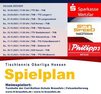 Zu Beginn der Saison startet unser Team am 16.09.2023 beim TTC Elz. Das erste Heimspiel findet am 2. Spieltag gegen die 2. Mannschaft des TTC Langen statt. Das Mittelhessenderby gegen den Gießener SV findet am Samstag, den 18.11.2023 in Braunfels statt. Das letzte Spiel der Vorrunde bestreitet die Truppe zu Hause gegen den TTC RW Biebrich.