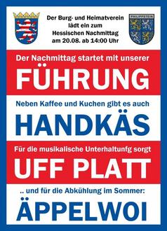 Am Sonntag, 20.8.2023 ab 14:00 Uhr findet der hessiche Nachmittag auf der Burg Philippstein statt. Hierzu lädt der Burg- und Heimatverein gerne ein, es gibt neben Kaffee und Kuchen auch Handkäs, natürlich passend dazu mit Äppelwoi. Für die musikalische Unterhaltung sorgt "Uff Platt".
