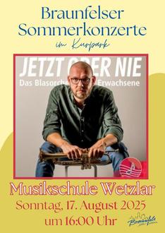 Ab 16:00 Uhr heißt es im Kurpark wieder: Bühne frei für Live-Musik unter freiem Himmel – diesmal mit dem „Jetzt oder Nie – Blasorchester“ der Wetzlarer Musikschule Lahn-Dill.