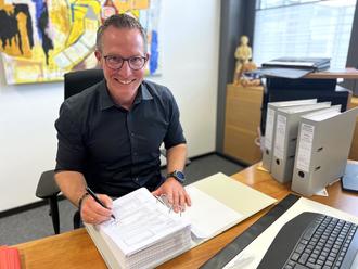 Landrat Carsten Braun unterzeichnete den Bauantrag – die nächsten Schritte für den Neubau der Käthe-Kollwitz-Schule stehen nun an. (Foto: Lahn-Dill-Kreis)