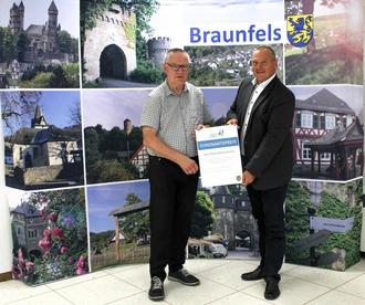 Die Stadt Braunfels wird zukünftig als Würdigung besonderen ehrenamtlichen Engagements pro Jahr drei Ehrenamtspreise verleihen. Als ehrenamtliche Tätigkeitsbereiche werden caritative oder soziale Betätigungsfelder, Initiativen zwischen Jung und Alt, Seniorenarbeit, Unterstützungen bei der Eingliederung ausländischer Mitbürgerinnen, Kinder- und Jugendbetreuung im sportlichen oder kulturellen Bereich, Hilfe zur Selbsthilfe, Umwelt- und Landschaftsschutz, Heimatpflege und Heimatkunde, der Tierschutz oder weitere ehrenamtliche Tätigkeiten sein. Hier mit einer Musterurkunde des Ehrenamtspreises (v.l.): Stadtverordnetenvorsteher Michael Hollatz und Bürgermeister Christian Breithecker (Foto: Stadt Braunfels)