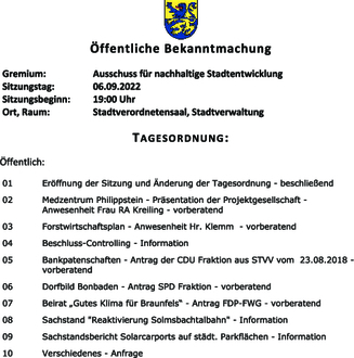 | Ort, Raum: | Stadtverordnetensaal, Stadtverwaltung Braunfels |