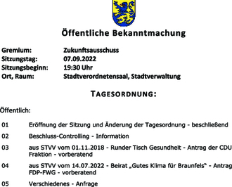 | Ort, Raum: | Stadtverordnetensaal, Stadtverwaltung Braunfels |