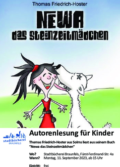 An diesem Nachmittag steht Newa, das Steinzeitmädchen im Mittelpunkt. Der Autor Thomas Friedrich-Hoster wird aus seinem Buch “Newa das Steinzeitmädchen” vorlesen und über abenteuerliche und spannende Geschichten erzählen. Dabei lernt ihr nicht nur Newa kennen, sondern könnt auch einiges über die Steinzeit erfahren. Natürlich dürft ihr dem Autor Fragen stellen, die euch besonders interessieren.