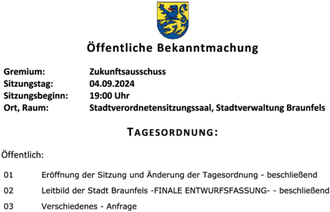 | Ort, Raum: | Stadtverordnetensitzungssaal, Stadtverwaltung Braunfels |