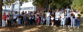 Die Absolventinnen und Absolventen mit Schulleiterin Kerstin Freund-Gutmann (Zweite von links), Kursleitung Karina Höppner (links), Kursleitung Karin Jääger (Dritte von links) und stellvertretender Schulleiter Markus Roth (Siebter von links). Foto: Bildungszentrum Lahn-Dill