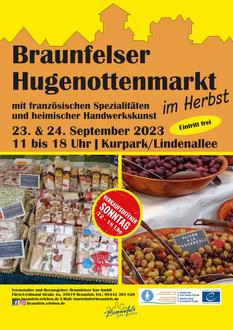 Am 23. und 24. September 2023 findet in Braunfels im Kurpark/Lindenallee der Braunfelser Hugenottenmarkt im Herbst statt. Der Markt ist an beiden Tagen von 11 bis 18 Uhr geöffnet. Zahlreiche Stände aus Frankreich bieten Leckereien wie Oliven und getrocknete Früchte, Wurstspezialitäten, Käse, Pasteten und Wein an. Erweitert wird das Angebot durch heimische Anbieter, die unter anderem Kräuter und Flammkuchen sowie handwerkliche Produkte aus eigener Herstellung anbieten.