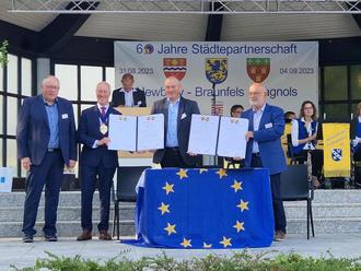 Sein französischer Amtskollege Jean-Yves Chapelet sprach von der unzertrennlichen Freundschaft zwischen den Menschen in Bagnols-sur-Cèze und Braunfels. Mit den Worten von Jean Monnet stellte er fest:“ Wir vereinen nicht Staaten oder Städte, sondern Menschen. “Er berichtete von seiner Enkelin, die in Frankreich geboren sei, in Deutschland in einer deutsch-französischen Familie aufwachse und damit im besten Sinne die Vereinigung unserer Kulturen und Träume verkörpere. Er übergab den Braunfelsern einen Granatapfelbaum, ein Symbol von Fruchtbarkeit und Langlebigkeit, um weiterhin Freundschaft und Frieden zu pflegen.