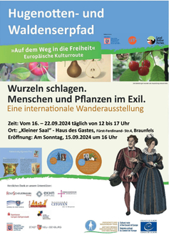 Der Verein Hugenotten-und Waldenserpfad e.V. zeigt in Kooperation mit der Braunfelser Kur GmbH und der Stadt Braunfels eine internationale Wanderausstellung mit dem Titel „Wurzeln schlagen. Menschen und Pflanzen im Exil“.