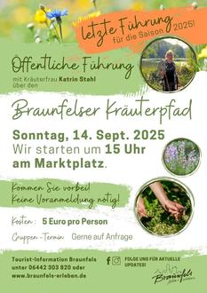 Am Sonntag, 14. September 2025, findet die letzte öffentliche Führung dieser Saison auf dem Braunfelser Kräuterpfad statt. Treffpunkt ist wie gewohnt um 15 Uhr am Marktplatz Braunfels, die Teilnahme kostet 5 Euro, eine Anmeldung ist nicht erforderlich.