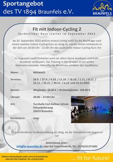 Der TV 1894 Braunfels bietet ab September 2023 in der Turnhalle der Carl-Kellner-Schule Braunfels einen zuätzlichen Indoor-Cycling-Kurs an.