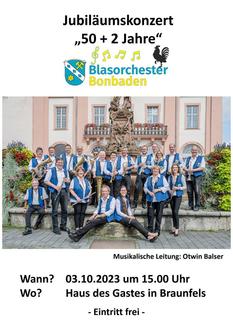 Mit 2 Jahren Verspätung findet am 03.10.2023 (Tag der Deutschen Einheit) unser Jubiläumskonzert im Haus des Gastes in Braunfels statt. Beginn ist um 15:00 Uhr. Hierzu laden wir alle Freunde unseres Orchesters und der böhmischen Blasmusik ganz herzlich ein.