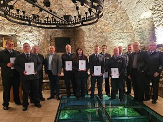 Während eines Empfangs im Braunfelser Hammerwerk gratulierten Bürgermeister Christian Breithecker (4. v. l.), Stadtverordnetenvorseher Michael Hollatz (2. v. r.), Stadtbrandinspektor Michael Rack (r.) sowie der stellvertretende Stadtbrandinspektor Sebastian Lohr (3. v. r.) den neun Kameraden und übergaben ihnen feierlich ihre Urkunden: (v. l.) Benjamin Dämon, Alexander Marchel-Wohlgemuth, Torsten Wilfling, Alexander Jung, Franziska Eckert, Maximilian Kissel, Chris Böcher, Michael Goßmann und Martin Bettner. (Foto: Stadt Braunfels)