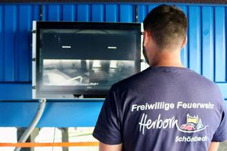 Über Monitore können die Ausbilder die Übung überwachen. Die Container sind mit Wärmebildkameras ausgestattet, sodass die Ausbilder trotz des Rauches das Vorgehen der Einsatzkräfte gut erkennen können. (Foto: Lahn-Dill-Kreis)