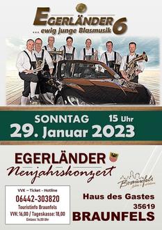 Am Sonntag, 29.01.23 heißt es im Haus des Gastes in Braunfels willkommen zum „Egerländer Neujahrskonzert“ präsentiert von 6 Musikern und einem Schlagzeuger.