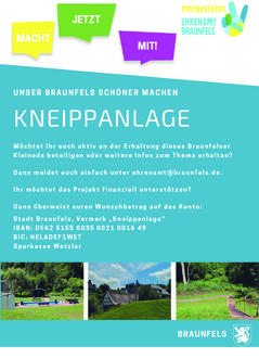 Die Stadt Braunfels sucht nun weitere Bürgerinnen und Bürger, die sich gerne an der Pflege und Bewirtschaftung der Braunfelser Kneippanlagen beteiligen möchten - auch Spenden sind möglich, dabei ist es egal, wie hoch die Spende ist.