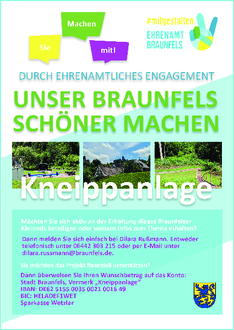 Die Stadt Braunfels sucht weitere Bürger, die sich gerne an der Pflege und Bewirtschaftung der Braunfelser Kneippanlagen beteiligen möchten. Auch Spenden sind möglich, hierbei entscheiden Sie, wie hoch die Spende sein soll.