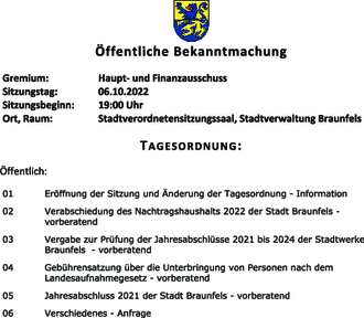 | Ort, Raum: | Stadtverordnetensitzungssaal, Stadtverwaltung Braunfels |