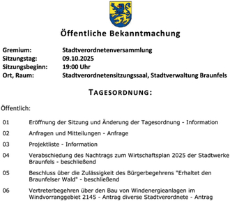 | 04 | Verabschiedung des Nachtrags zum Wirtschaftsplan 2025 der Stadtwerke Braunfels - beschließend |