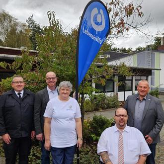 Bürgermeister Christian Breithecker (r.) und Stadtbrandinspektor Michael Rack (l.) besuchten die Florentine vor Ort, um dem Team die besten Glückwünsche zum 60-jährigen Jubiläum zu überbringen: Sebastian Ziegler, Vorstand im Bereich Arbeit bei der Lebenshilfe Wetzlar-Weilburg e.V., Martina Weinbrenner, zweite stellvertretende Frauenbeauftragte der Florentine und Sascha Scheffler, stellvertretender Vorsitzender des Werkstattrats der Florentine. (Foto: Stadt Braunfels)