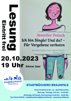 Das Team der Stadtbücherei Braunfels möchte Sie zu einer besonderen Lesung am 20. Oktober um 19 Uhr im ‘Kleinen Saal‘ neben der Stadtbücherei Braunfels einladen. Die Autorin Jennifer Petsch wird aus ihrem Buch „Ich bin Single! Und du? - Für Vergebene verboten - Aus dem Leben eines unfreiwilligen Singles“ vorlesen und uns an ihren lustigen und lehrreichen Erfahrungen teilhaben lassen.