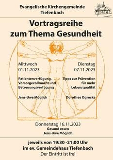 Die evangelische Kirchengemeinde Tiefenbach veranstaltet eine Vortragsreihe zum Thema Gesundheit und lädt dazu herzlich in das ev. Gemeindehaus Tiefenbach ein. Es werden drei Vorträge angeboten: Zur Prävention, zu den vorsorgenden Verfügungen und zu gesundem Essen.