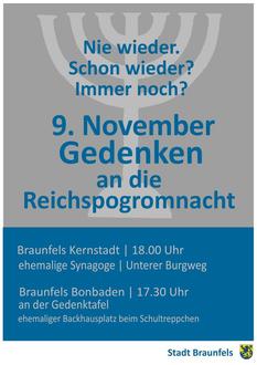 In Braunfels-Bonbaden legt Burkhard Hinz, stellvertretender Stadtverordnetenvorsteher, um 17.30 Uhr an der Gedenktafel, ehemaliger Backhausplatz am Schultreppchen, einen Kranz nieder.