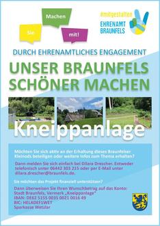 Die Stadt Braunfels sucht weitere Bürger, die sich gerne an der Pflege und Bewirtschaftung der Braunfelser Kneippanlagen beteiligen möchten. Auch Spenden sind möglich, hierbei entscheiden Sie, wie hoch die Spende sein soll.