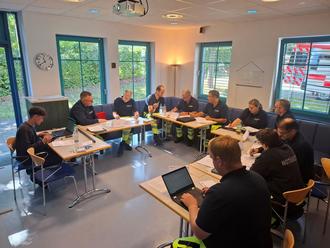 Vorbesprechung der Einsatzsimulation: Elf Teilnehmende, die in der Einsatzleitung Rettungsdienst tätig sind, übten worauf es bei der Führung und Koordination bei medizinischen Notfällen ankommt. (Foto: Lahn-Dill-Kreis)