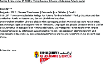 In der Aula der Johannes-Gutenberg-Schule werden diese Woche und in der nächsten Woche drei Filme der „Globale- Filmfestival für globale Gerechtigkeit“ gezeigt. Die Filme beschäftigen sich mit verschiedenen Themen, die unser aller Leben in unterschiedlichster Weise tangieren und zum Nachdenken anregen.