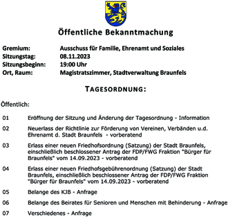 | 03 | Erlass einer neuen Friedhofsordnung (Satzung) der Stadt Braunfels, einschließlich beschlossener Antrag der FDP/FWG Fraktion "Bürger für Braunfels" vom 14.09.2023 - vorberatend |