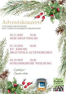 In diesem Jahr haben wir charmante und stimmgewaltige Unterstützung des Frauenchores „Cantabile“ aus Kraftsolms. Wir werden von Instrumentalistinnen begleitet und möchten unseren Zuhörerinnen und Zuhörern einen harmonischen und klangvollen Start in die Adventszeit bereiten. Kommen Sie also gerne am 28.11.2025 nach Kraftsolms ins Dorfgemeinschaftshaus, am 01.12.2025 in die evangelische Kirche nach Braunfels-Altenkirchen oder am 05.12.2025 in die Schlosskirche nach Weilburg. Die Konzerte beginnen um 19:30, Einlass: 19:00. Der Männergesangverein aus Philippstein und der Frauenchor aus Kraftsolms, mit dem gemeinsamen Chorleiter Simon Fell, lädt Sie herzlich ein!