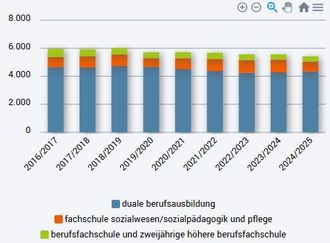 Die Zahl der Auszubildenden mit Wohnort im Lahn-Dill-Kreis ist – laut Daten des Hessischen Statistischen Landesamtes – weiter rückläufig. Im Schuljahr 2024/2025 wurden 5.422 Auszubildende gezählt – das sind 133 weniger als im Vorjahr und über 580 weniger als beim bisherigen Höchststand mit 6.004 Auszubildenden im Schuljahr 2018/2019. Besonders deutlich fiel der Rückgang bei schulischen Ausbildungsformen aus – vor allem in der Fachschule Sozialwesen/Sozialpädagogik und Pflege sowie in der Berufsfachschule und zweijährigen höheren Berufsfachschule. Die Zahl der Auszubildenden in dualer Ausbildung stieg hingegen leicht an.