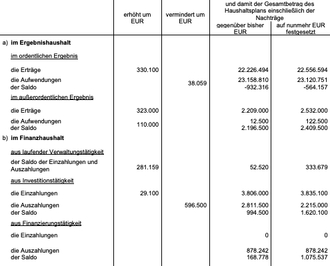 Der Ergebnishaushalt weist ein Defizit von 564.157 EUR im ordentlichen Ergebnis und einen Überschuss von 1.845.343 € im Jahresergebnis aus.