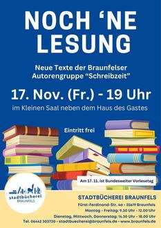 Anlässlich des bundesweiten Vorlesetages und pünktlich zum herbstlichen Lesewetter präsentiert die Stadtbücherei Braunfels die heimische Autorengruppe SCHREIBZEIT. Im Rahmen einer Lesung stellen die acht Autorinnen und Autoren aus Braunfels, Solms, Wetzlar und Hohenahr am Freitag, den 17. November um 19:00 Uhr im Kleinen Saal neben dem Braunfelser Haus des Gastes ihre individuellen Bücher und Geschichten vor.