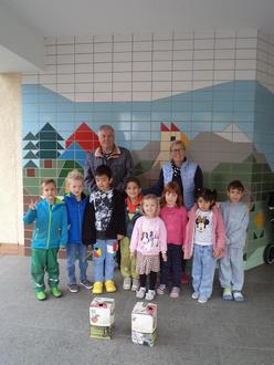 Otto Gilcher vom Obst- und Gartenbauverein, Kita-Leiterin Gabi Bode und Kitakinder. (Foto: Kita Bonbaden)