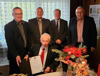 In einer kleinen privaten Feierstunde überreichten der Braunfelser Stadtverordnetenvorsteher Michael Hollatz und Bürgermeister Christian Breithecker Herrn Günter Jakob die Ehrenbürgerurkunde. Außerdem nahmen Gerd Mathes und Vorsitzender des Partnerschaftsrings Michael Reitz teil.