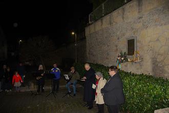 Für die Stadt Braunfels legte der stellvertretende Stadtverordnetenvorsteher Burkhard Hinz einen Kranz nieder. Die Gedenkfeier wurde durch die Gerhild Kirschner und Pfarrer Reinhard Vollmer gestaltet. Musikalisch umrahmt wurde die Veranstaltung von Sabine (Saxophon) und Joachim Burle (Trompete) sowie Thomas Kirchhof (Gitarre) mit hebräischen Waisen. Frau Kirschner, die sich seit Jahren mit Leben der einst in Bonbaden wohnenden Juden befasst, berichtete, dass im Jahr 1900 mit 32 von 649 Bonbadenern, rund fünf Prozent der Dorfbewohner Juden waren. Sie schilderte das Schicksal der 16 Familienmitglieder der Liebmanns aus der Schulstraße 7, von denen nur zwei in die USA flüchten konnten. Die Anderen verstarben vorher bzw. elf wurden im KZ umgebracht.