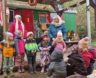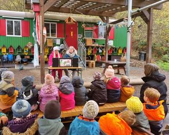 „Wer von euch weiß, was das für eine Sprache ist?“, fragte Kitaleiterin Sabine Zöller die Kinder der Waldkita Fledermäuse am Montagvormittag. „Russisch“, rufen einige der Kinder gemeinsam. Die Rede ist von einem selbstausgedachten Bilderbuch, das eine Erzieherin gemeinsam mit den Kindern erstellt hat. Dieses Buch wurde nun auf dem Gelände der Waldkita in Braunfels auf Deutsch und Russisch vorgelesen. Die russische Übersetzung übernahm Mariia Chyrychanska aus der Ukraine. Sie macht aktuell ein Praktikum bei den Fledermäusen. Im Publikum saßen Kitakinder, Erzieherinnen, Hans-Jürgen Gutzeit (Leiter der Braunfelser Stadtbücherei) sowie Ocsana Gut, die Lesungen auf ukrainisch während der Interkulturellen Woche durchführte.