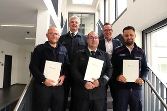 Freuen sich auf die Zusammenarbeit im Katastrophenschutz-Ehrenamt (von links): Florian Springer, Kreisbrandinspektor Harald Stürtz, Paschalis Leipidis, Carsten Braun und Robin Langer. (Foto: Lahn-Dill-Kreis)
