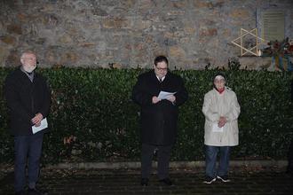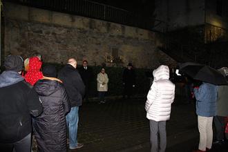 Trotz Regenwetter und an einem Sonntagnachmittag hatten sich rund 40 Bonbadener Bürgerinnen und Bürger anlässlich der Reichsprogromnacht am 9.11.1938 zur Gedenkfeier am ehemaligen Backhausplatz eingefunden. Hier erinnert eine Tafel an die 43 Juden, die 1930 noch in Bonbaden gewohnt hatten. 11 von ihnen starben vor dem Abtransport in ein Konzentrationslager, 17 Menschen wurden von den Nazis in Konzentrationslagern umgebracht. 13 der Bonbadener Juden konnten in die USA oder nach England fliehen,2 Schicksale sind unbekannt Für die Stadt Braunfels legte der stellvertretende Stadtverordnetenvorsteher Burkhard Hinz ein Blumengesteck nieder. Die Gedenkfeier wurde durch die Gerhild Kirschner und Pfarrer Reinhard Vollmer gestaltet. Musikalisch umrahmt wurde die Gedenkfeier durch Christine Häuser (Klarinette), Sabine Burle (Saxophon) und Joachim Burle (Gitarre). Sie spielten neben zwei weiteren Stücken das Lied „Die Moorsoldaten“ Das Lied wurde 1933 von drei Häftlingen im KZ Börgermoor im Emsland geschaffen. Burkhard Hinz erinnerte an die Nacht vor 87 Jahren, als in Deutschland die Synagogen brannten und an die vielen jüdischen Mitbürger, die danach in Konzentrationslager verbracht und dort ermordet wurden. Die Worte „Nie wieder“ sind das Fundament unseres Gedenkens, sagte Hinz. Der Nahost-Konflikt, der mit dem Terrorangriff im Oktober 2023 begann und dem der israelische Einmarsch in Gaza folgte habe auch bei uns in Deutschland tiefe Spuren hinterlassen. Der Anstieg von 21 Prozent der Straftaten gegenüber dem Vorjahr zeigt, dass der Antisemitismus eine wachsende Gefahr bedeute. Für ihn als Nicht Betroffenen wirke es zutiefst beunruhigend, wie der israelische Ministerpräsident Netanjahu den Krieg gegen die Hamas aber auch gegen den Iran offenbar zu innenpolitischen Zwecken nutze um seine angeschlagene politische Situation zu festigen. „Wir dürfen in Deutschland nicht zulassen, dass die Tragödie der Menschen gerade in Gaza als Vorwand dient, um in Deutschland Gewalt und Hass gegen Mitmenschen jüdischen Glaubens zu schüren oder zu legitimieren. „Wir können die Verbrechen von damals nicht ungeschehen machen, aber wir können dafür sorgen, dass sich so etwas niemals wiederholt“. Pfarrer Reinhard Vogelberichtete zum Schluss von seinen Gesprächen mit einem Gefängnispfarrer und betonte, dass trotz schrecklicher Taten bleibe die Würde eines solchen Meschen unantastbar bleibe. „Nur wenn wir die Würde jedes Menschen achten, gibt es einen gemeinsamen Boden für unsere Gesellschaft, etwas, was uns zusammenhält bei allen Gegensätzen.“