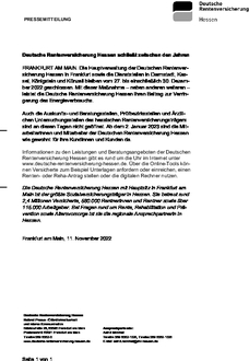Die Deutsche Rentenversicherung Hessen mit Hauptsitz in Frankfurt am Main ist der größte Sozialversicherungsträger in Hessen. Sie betreut rund 2,4 Millionen Versicherte, 580.000 Rentnerinnen und Rentner sowie über 115.000 Arbeitgeber. Bei Fragen rund um Rente, Rehabilitation und Prävention sowie Altersvorsorge ist sie die regionale Ansprechpartnerin in Hessen.