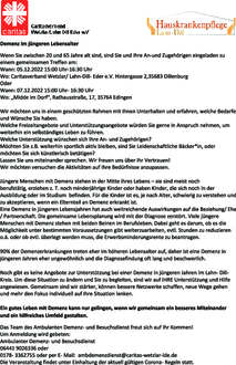 Das Team des Ambulanten Demenz- und Besuchsdienst freut sich auf Ihr Kommen! Um Anmeldung wird gebeten: