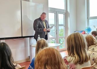 Der Bürgermeister übergab das Buch im Anschluss als Geschenk an die Grundschule Bonbaden: „Das Buch geht sehr spannend weiter – so viel kann ich verraten. Ich lasse euch das Buch hier, dann könnt Ihr es zu Ende lesen.“